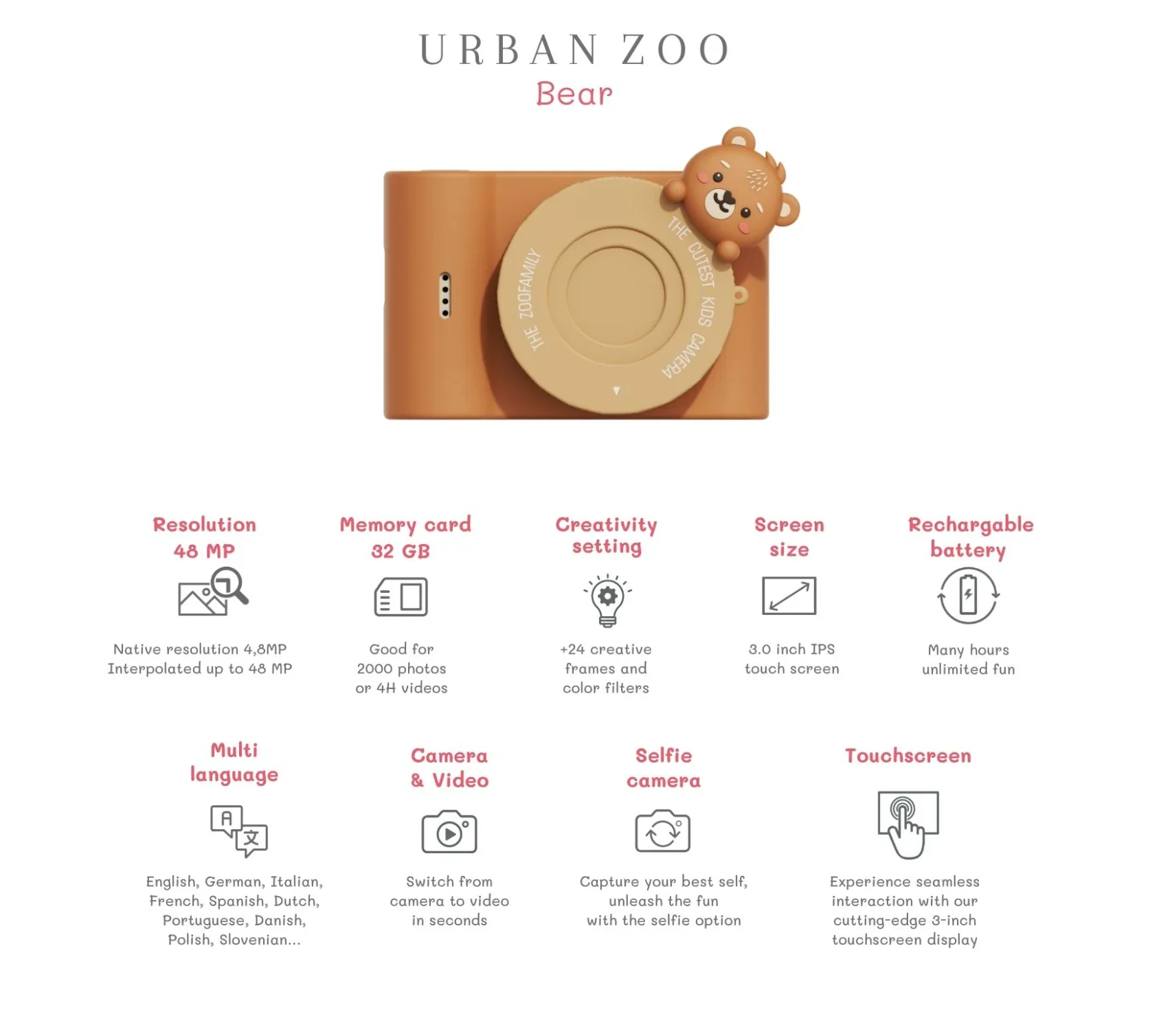 Insufflez une touche de magie et de sécurité avec le capuchon d’objectif à thème ours inclus. Ce capuchon ajoute non seulement une touche fantaisiste, mais protège également contre les rayures et les impacts mineurs. L’appareil photo de votre enfant reste toujours prêt pour l’aventure, tout comme lui !