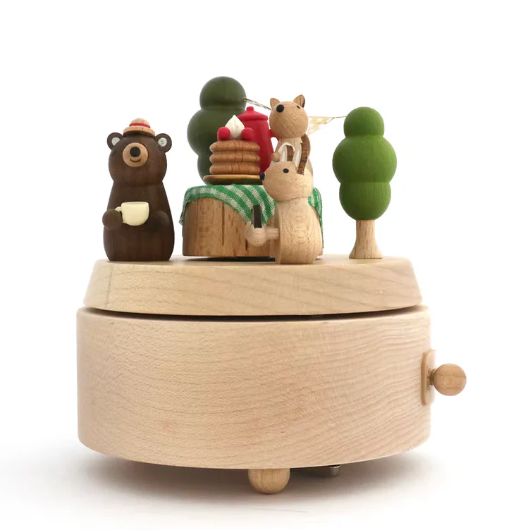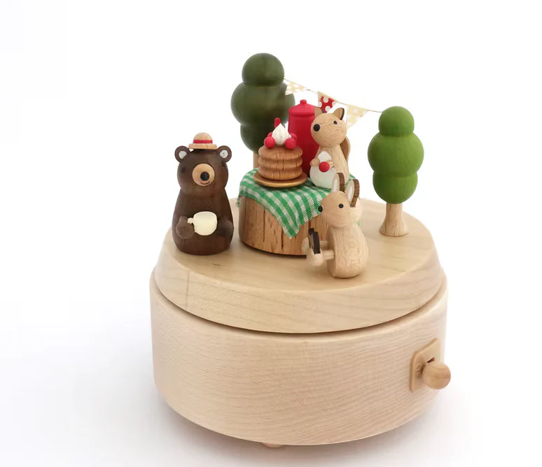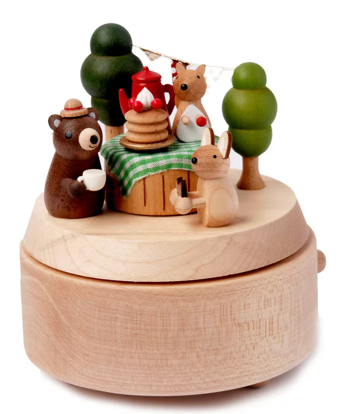 Boîte à musique en bois avec les petits animaux de la forêt en plein pic-nic. Une clé située sous la boîte musicale permet d’activer le mécanisme.