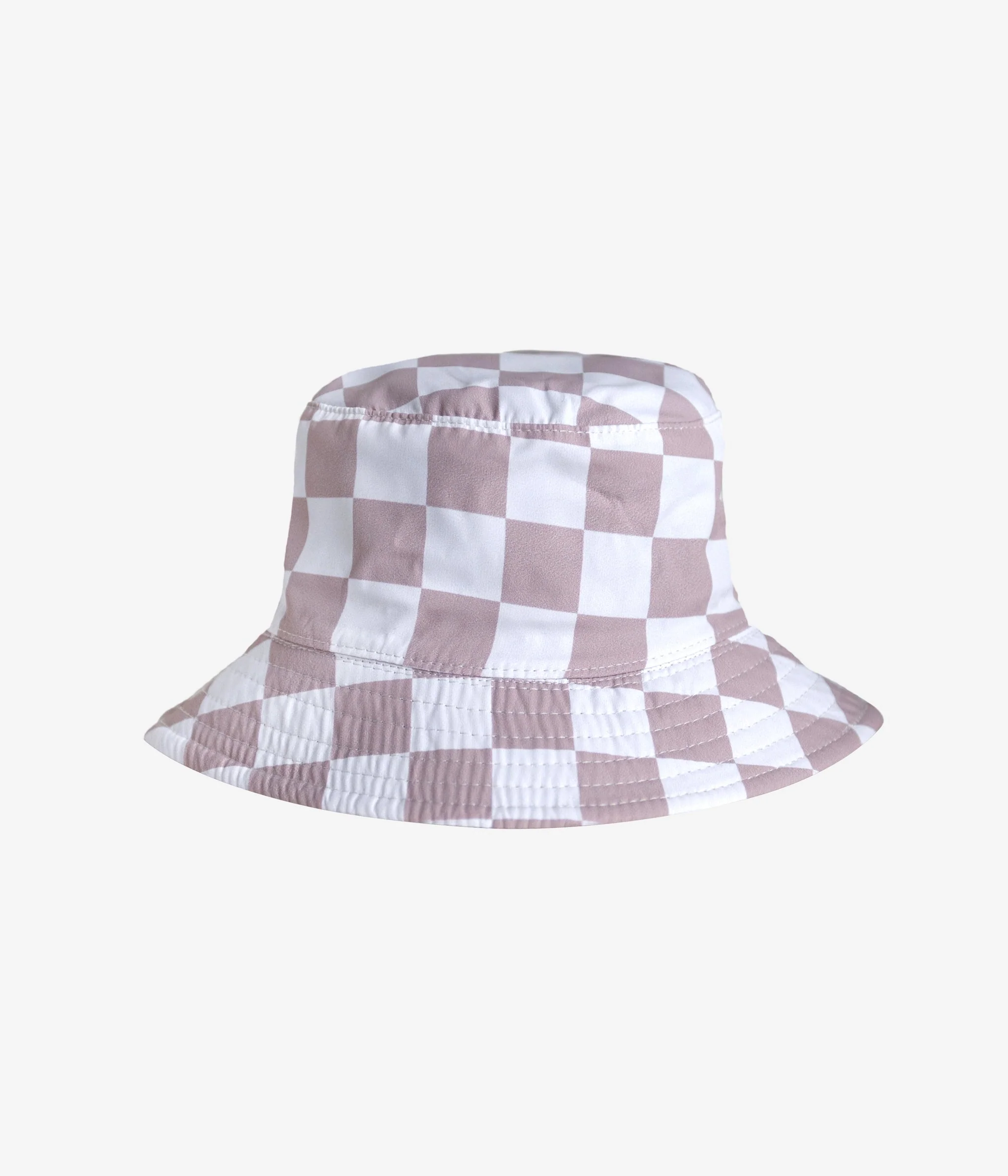 Chapeau « bucket hat » réversible pour enfant avec motif à carreaux beige.