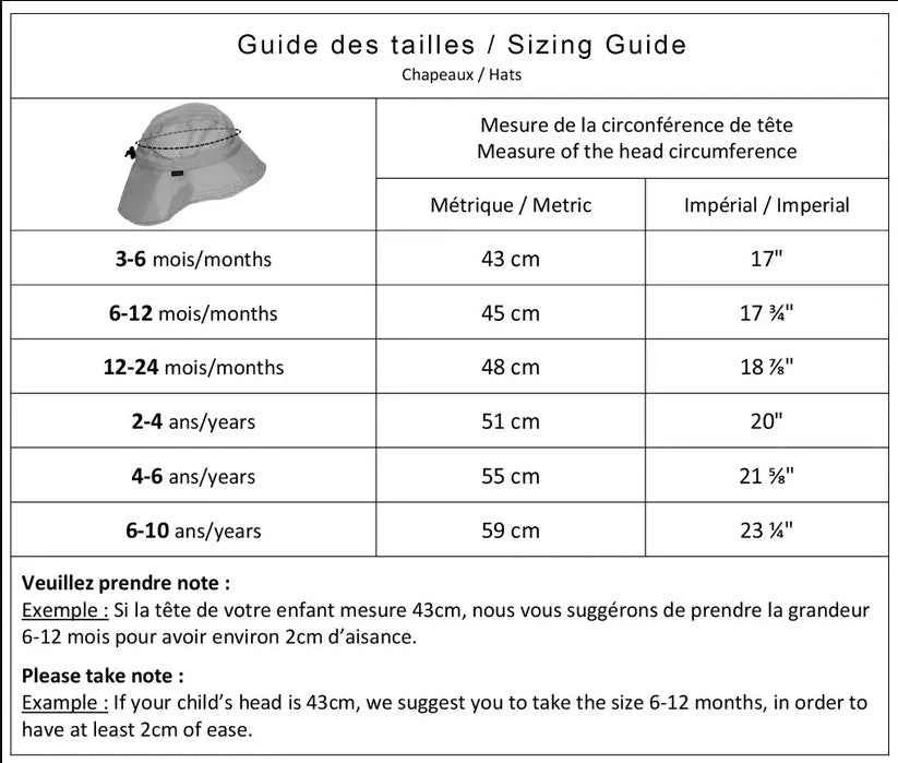 - Cordon d’ajustement au tour de tête pour que le chapeau grandisse avec votre enfant.