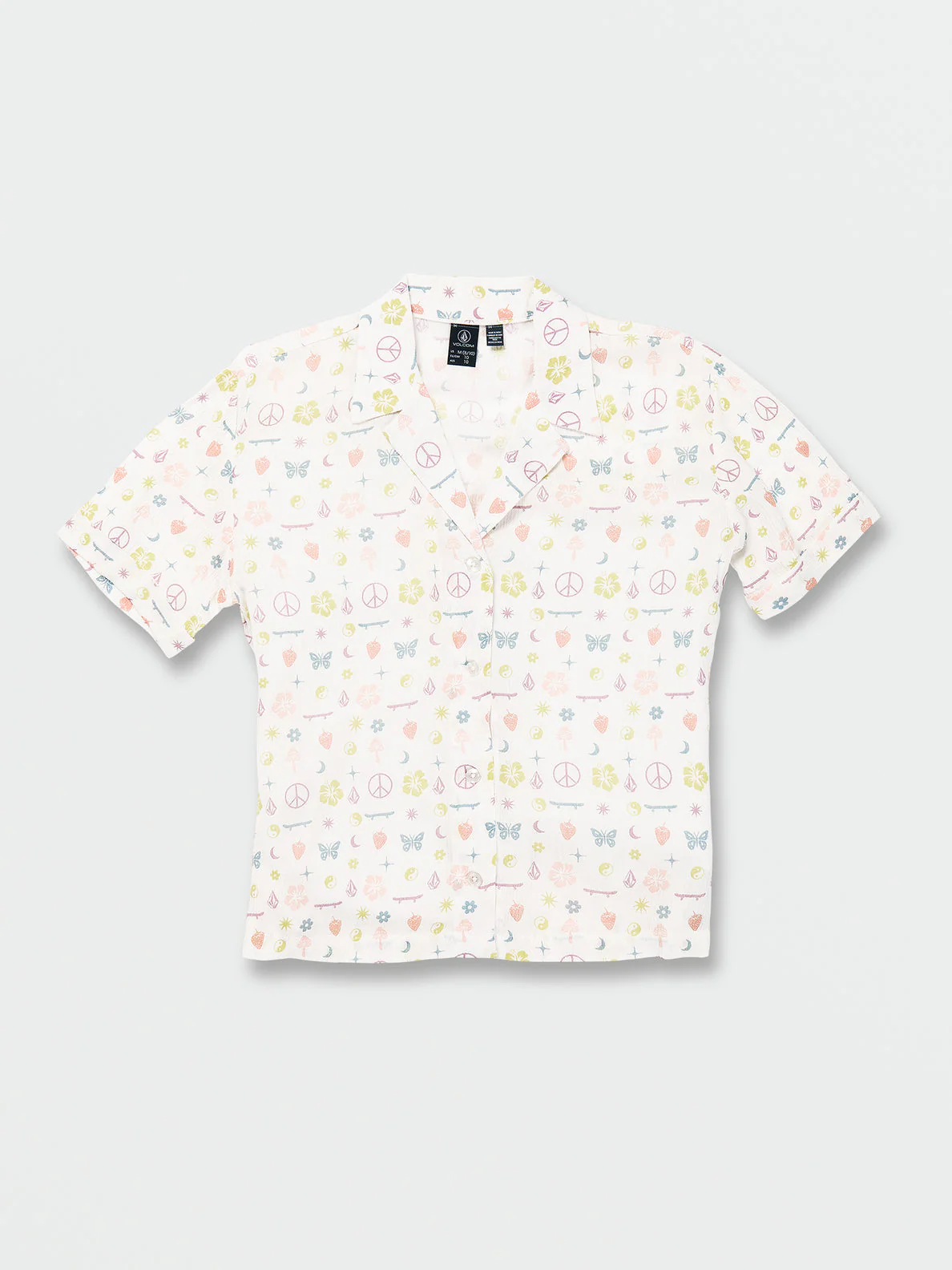 La chemise FILLE STICKERBOOK de Volcom arbore un motif imprimé et son tissu en gaze de viscose offre une respirabilité idéale pour le confort. Sa coupe boxy et ses manches courtes à revers font de cette chemise un ajout idéal à votre garde-robe. 100% gaze de viscose.