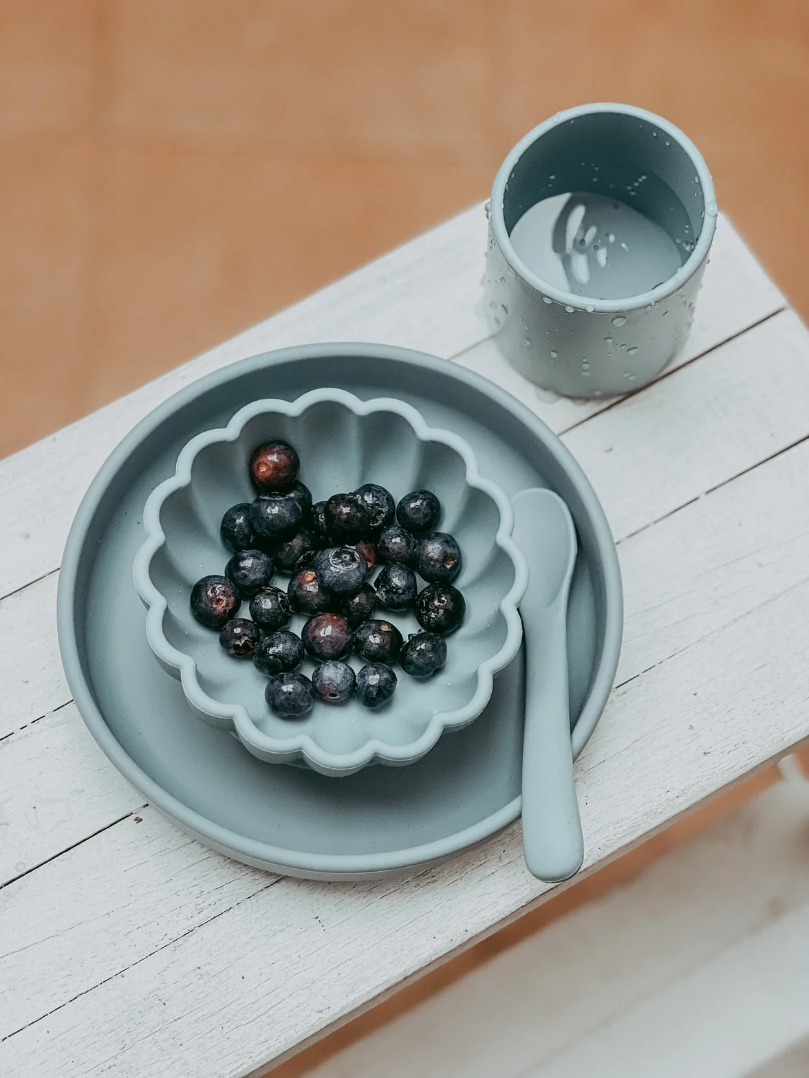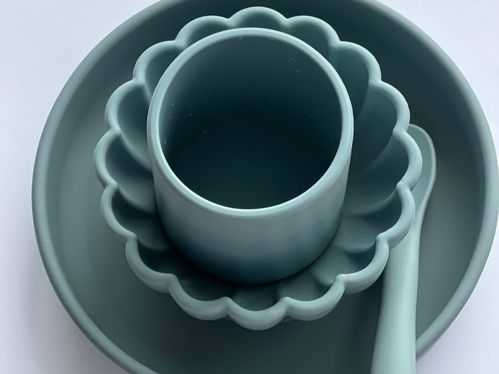 Ce set repas est fabriqué en silicone 100 % alimentaire. Il se compose de quatre pièces : assiette, bol, verre et cuillère.