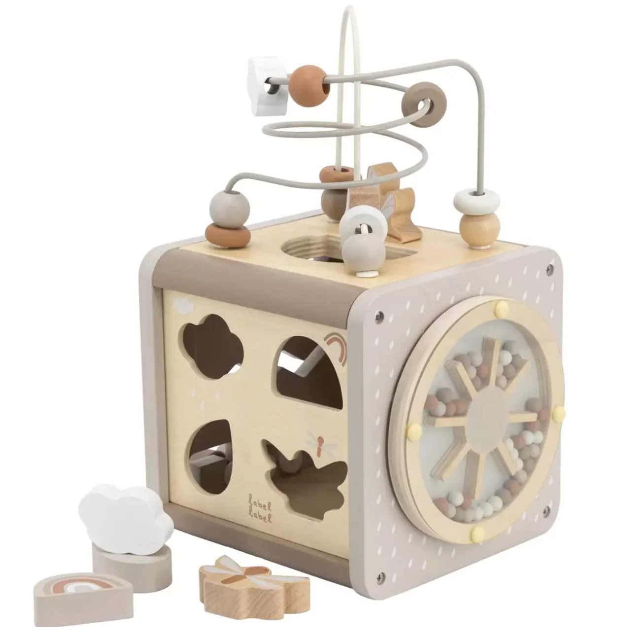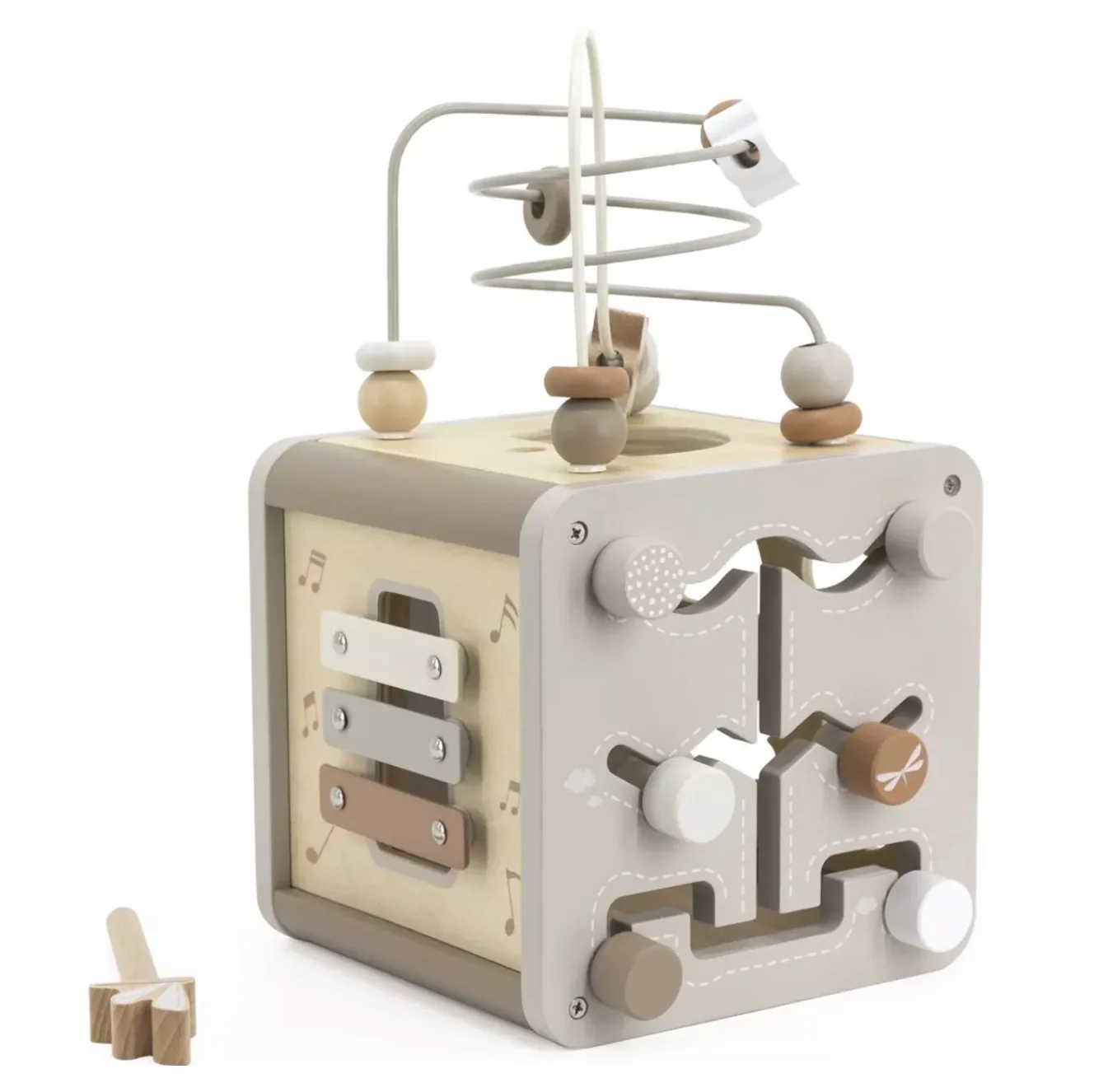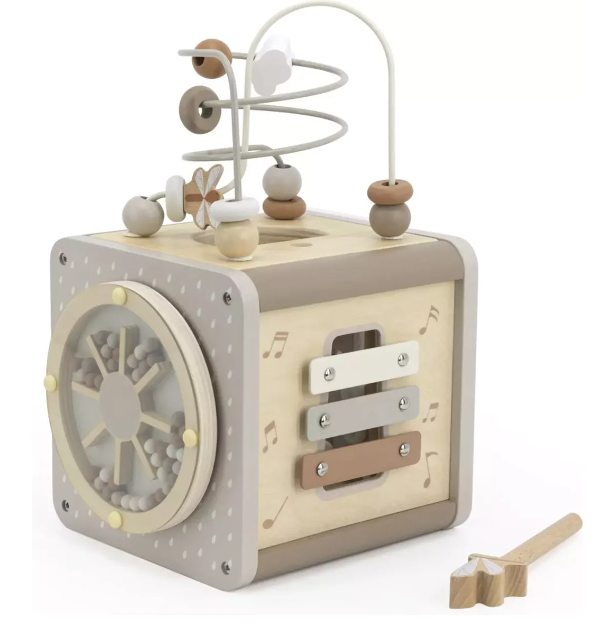 Le cube d’activités 5 en 1 comprend un trieur de formes, des engrenages, un labyrinthe de pistes, un xylophone et un labyrinthe de perles pour garder les enfants engagés.