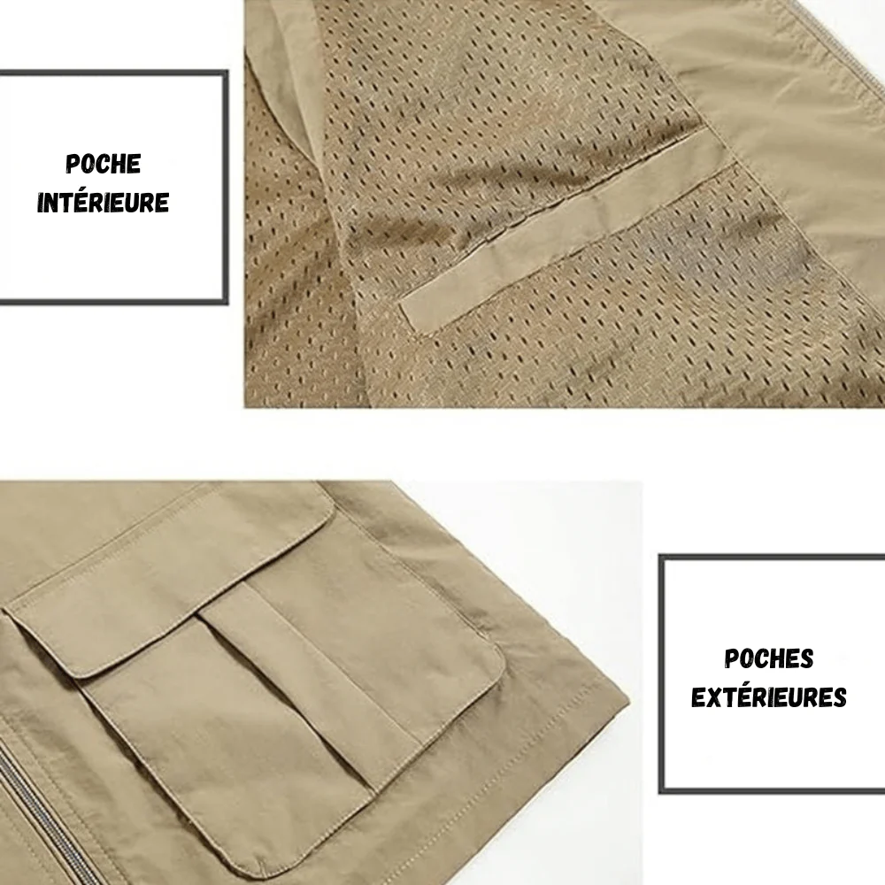 - Poches : 6 (2 poches poitrine à rabat, 2 latérales, 2 intérieures)