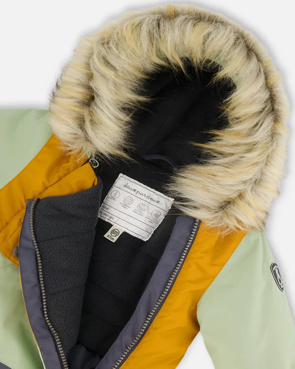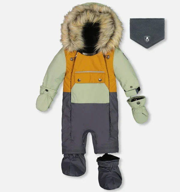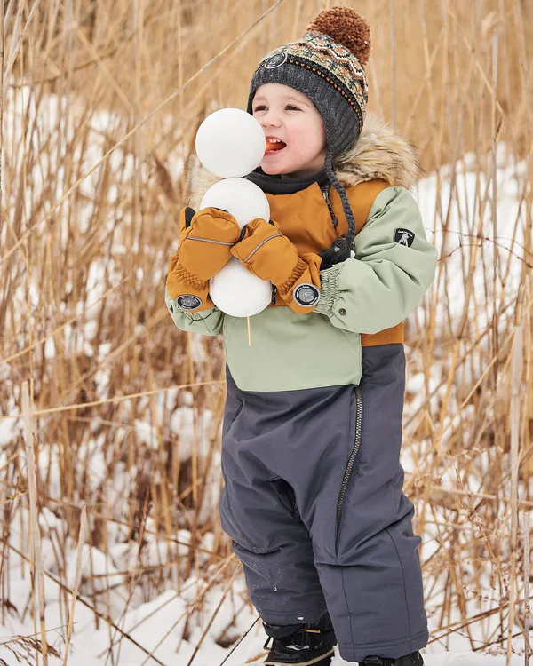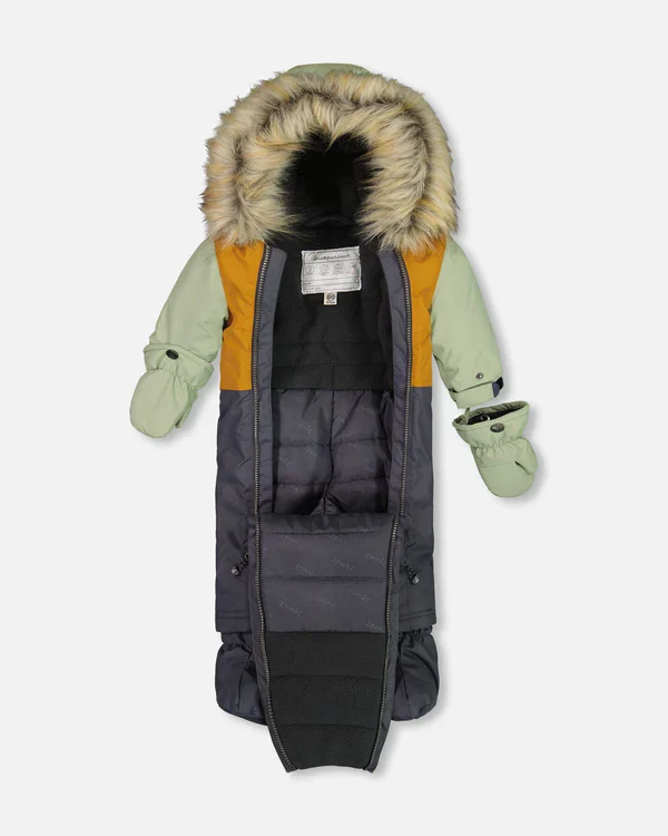 L’habit de neige sauge, brun et gris foncé pour bébé de Deux par Deux est conçu pour nos froides journées d’hiver et s’adapte au siège d’auto.