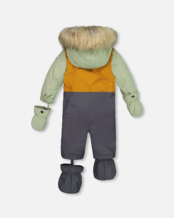 Habit d’hiver 1 pièce pour bébé de Deux Par Deux de couleur sauge, brun et gris foncé.
