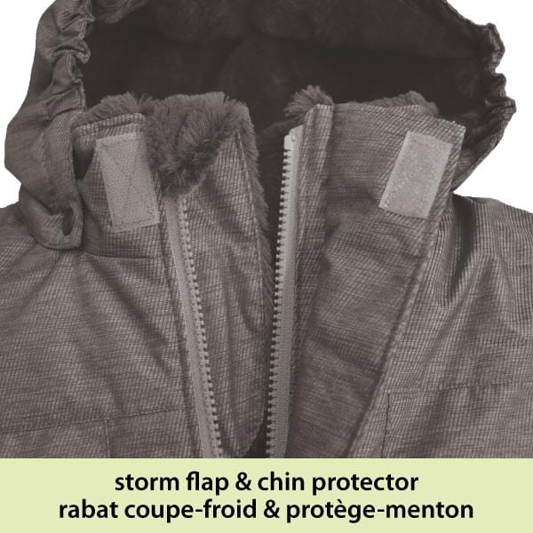 - Entretien : Retirer la bande de fourrure avant de laver. Laver à l’eau froide. Suspendre pour sécher. Ne pas blanchir/Ne pas repasser. Pas de nettoyage à sec