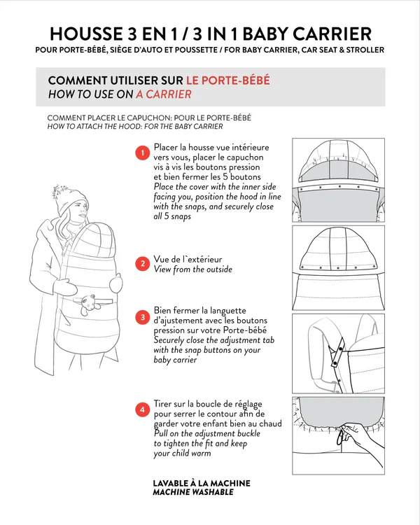 • Attaches latérales universelles pour fixer la pochette au porte-bébé ou poussette ou siège d’auto