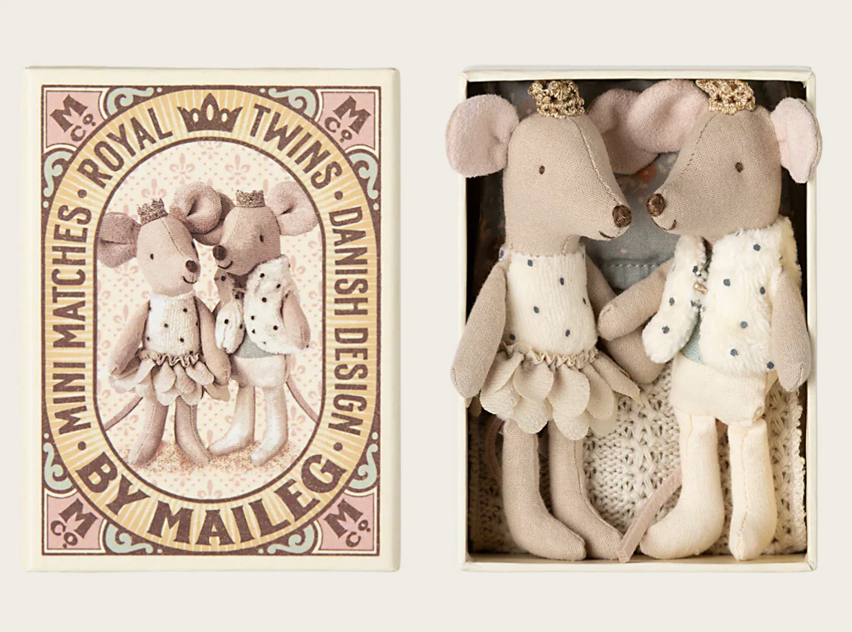 Les jumeaux royaux dorment confortablement à l’intérieur d’une jolie boîte d’allumettes décorée de leur portrait, sur le devant.