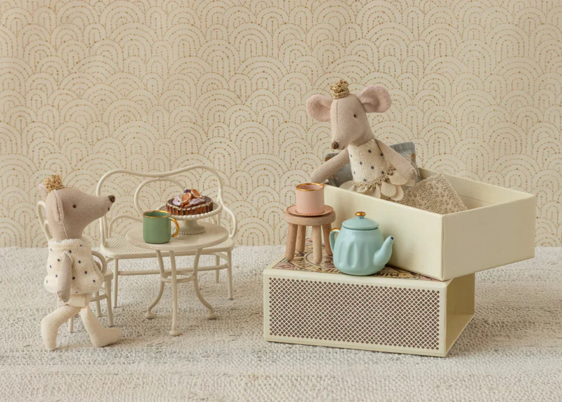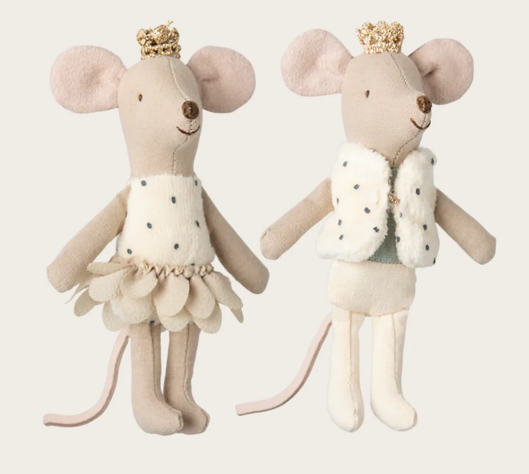 La petite soeur princesse et le petit frère princier portent des couronnes dorées et d’élégants habits assortis.