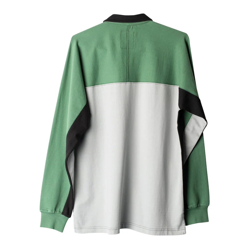 Coupe carrée, polo de rugby à manches longues avec col dans le même tissu et patte de boutonnage dissimulée, poche poitrine zippée à l’avant avec ruban à chevrons, aisselles à soufflet, poignets côtelés, ourlet plongeant dans le dos et fentes latérales, étiquette de cou à transfert de chaleur à l’arrière.
