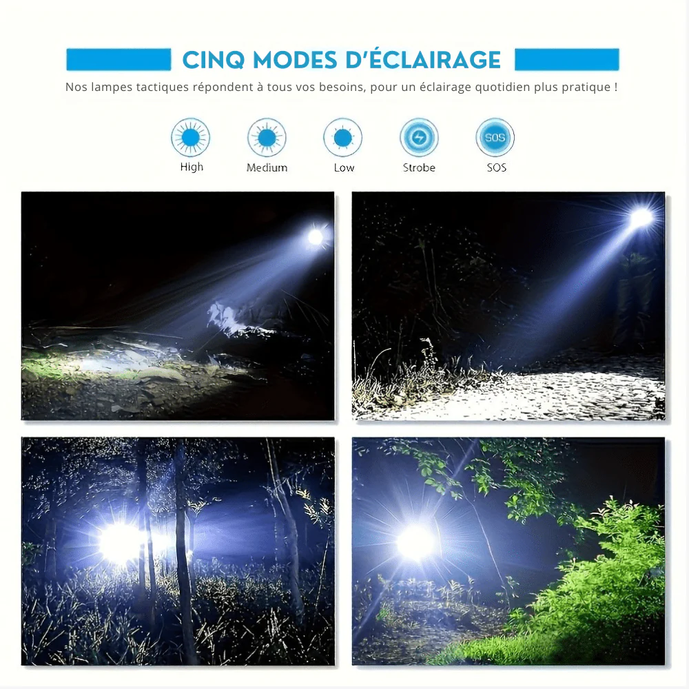 • Cinq modes : fort, moyen, faible, stroboscopique, SOS