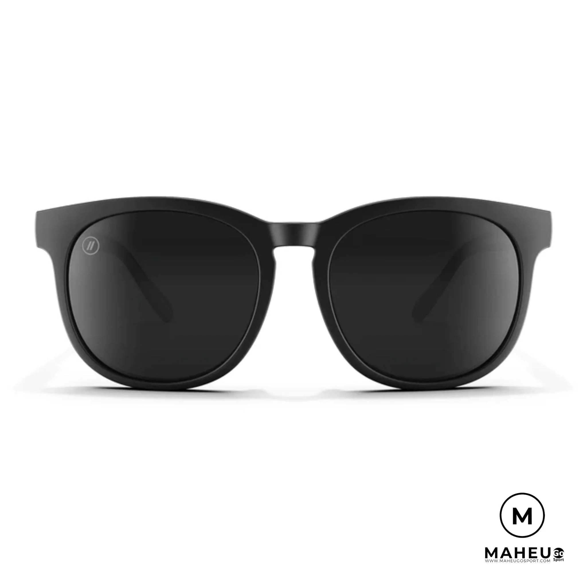 La monture mate est ornée de logos brillants contrastants et incolores, tandis que les verres sont fumés polarisés.