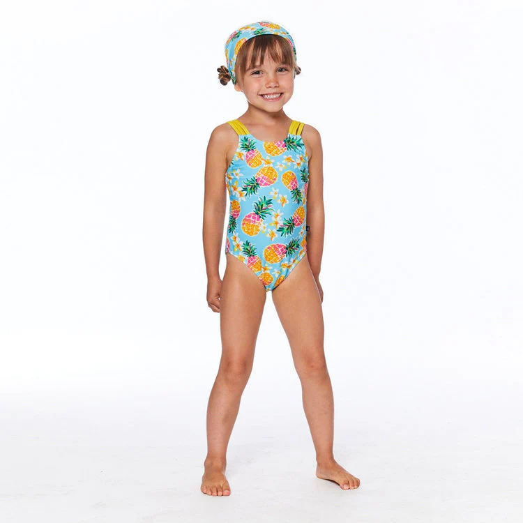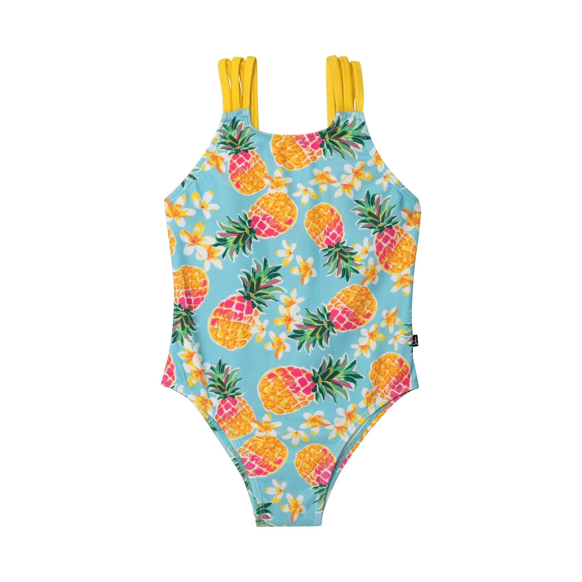 Les triples bretelles spaghetti ajoutent un style unique à notre maillot de bain une pièce bleu imprimé ananas. Offrant une protection solaire UPF 50+, ce maillot de bain présente une silhouette classique avec un imprimé ananas, une encolure dégagée et des bretelles jaunes contrastantes.
