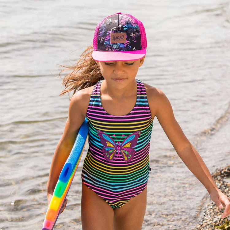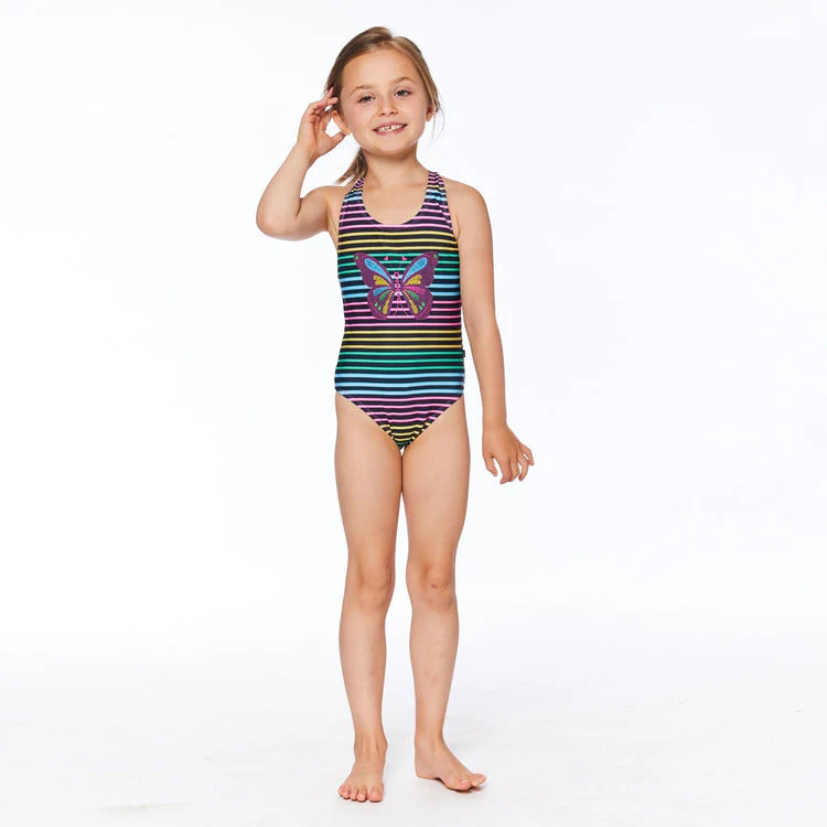Notre maillot de bain une pièce rayé noir multicolore est un choix parfait pour la petite fille qui aime jouer dans le sable et barboter dans l’eau. Doux et extensible en tissu REPREVE® recyclé, ce maillot de bain présente des rayures horizontales colorées et un motif de papillon sur la poitrine. Il est agrémenté d’une encolure dégagée et de larges bretelles qui s’entrecroisent dans le dos.