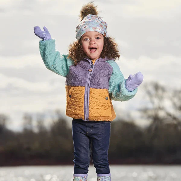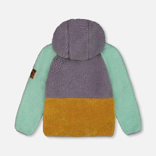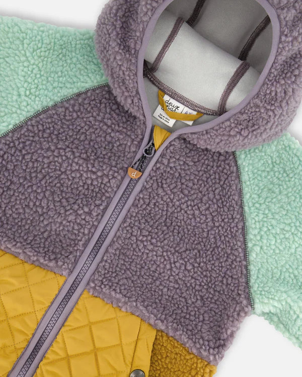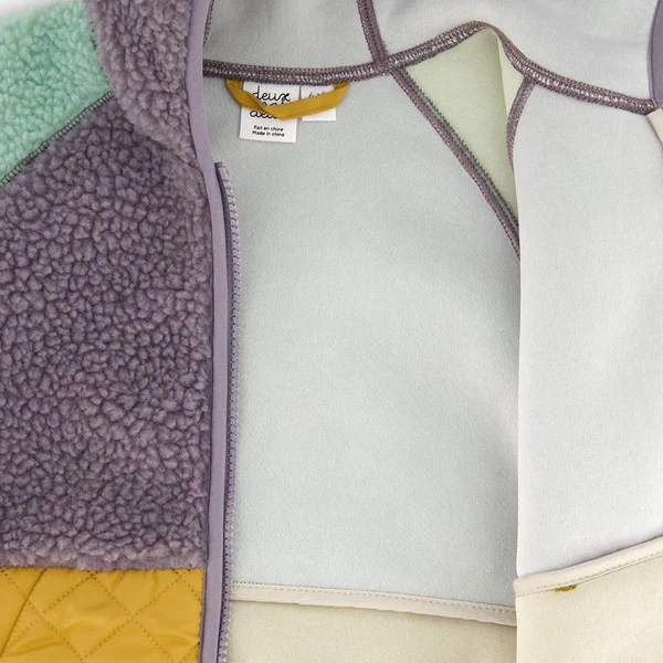 Le manteau mi-saison en sherpa blocs de couleurs lilas, turquoise et jaune offre un confort douillet lors des journées fraîches !