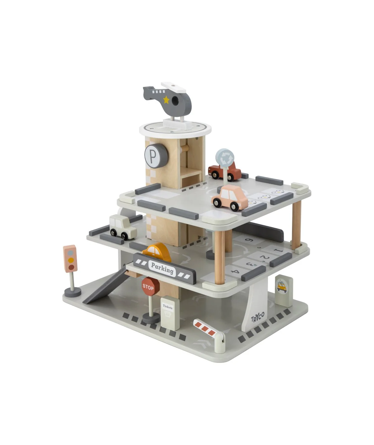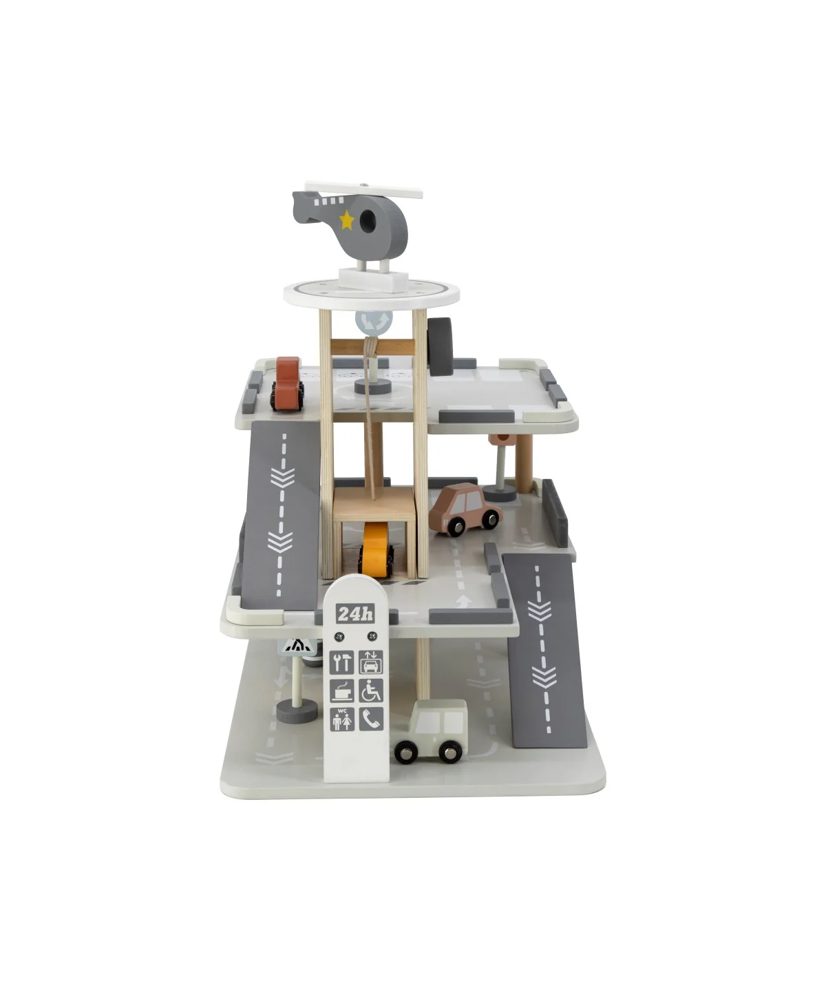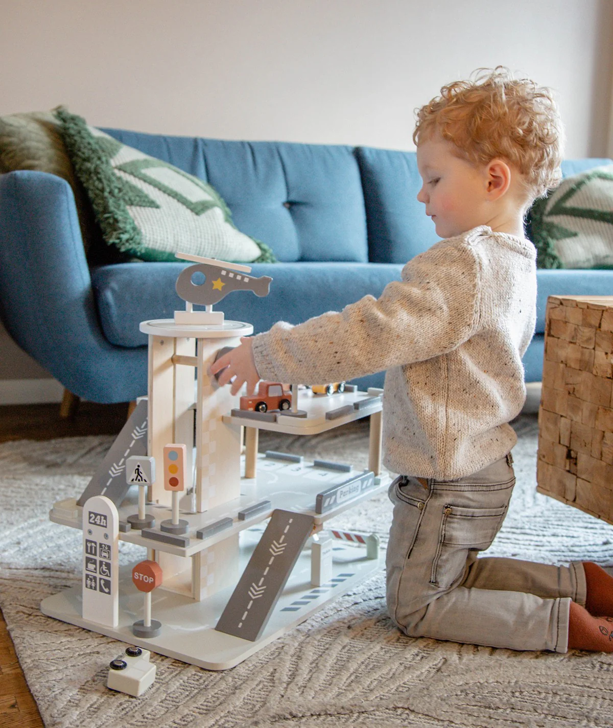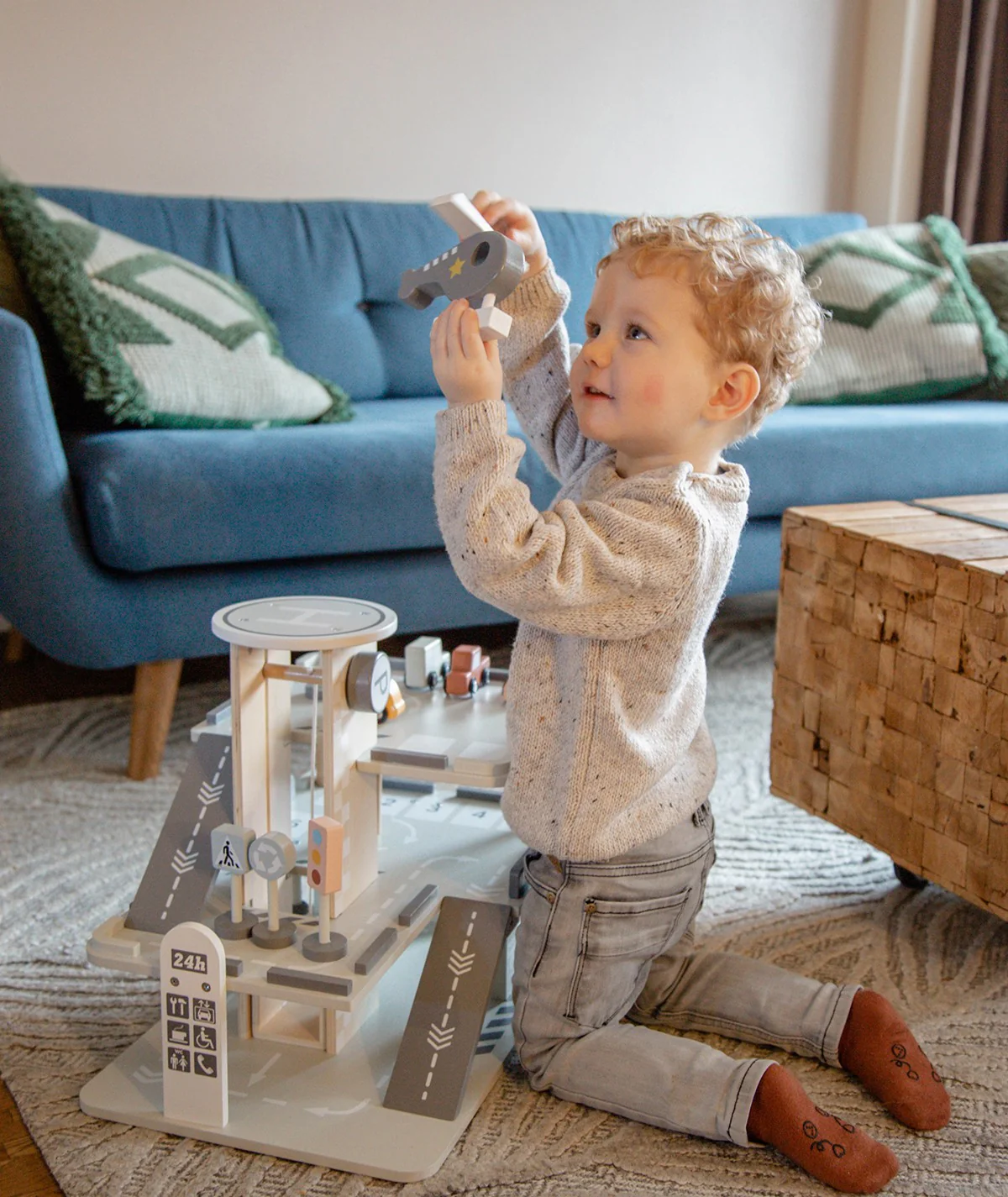 Avec ce grand parc de stationnement en bois, votre enfant stimule son imagination et augmente sa motricité. Le garage comprend 4 voitures, un hélicoptère, 4 panneaux routiers, une barrière, un lave-auto, un point de recharge électrique et un treuil.