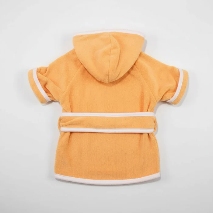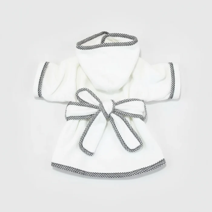 - S : Tour de cou =35 cm / Tour de poitrine = 52 cm / Longueur dos = 30-35cm / Longueur peignoir (hors capuche) = 33 cm.
