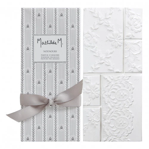 Tablette en plâtre parfumé et ciselé à la main. Emblème de la marque, fabriquée et parfumée dans nos ateliers. Imprégnée de parfum, cette tablette libère lentement et pour longtemps le parfum Nounours.