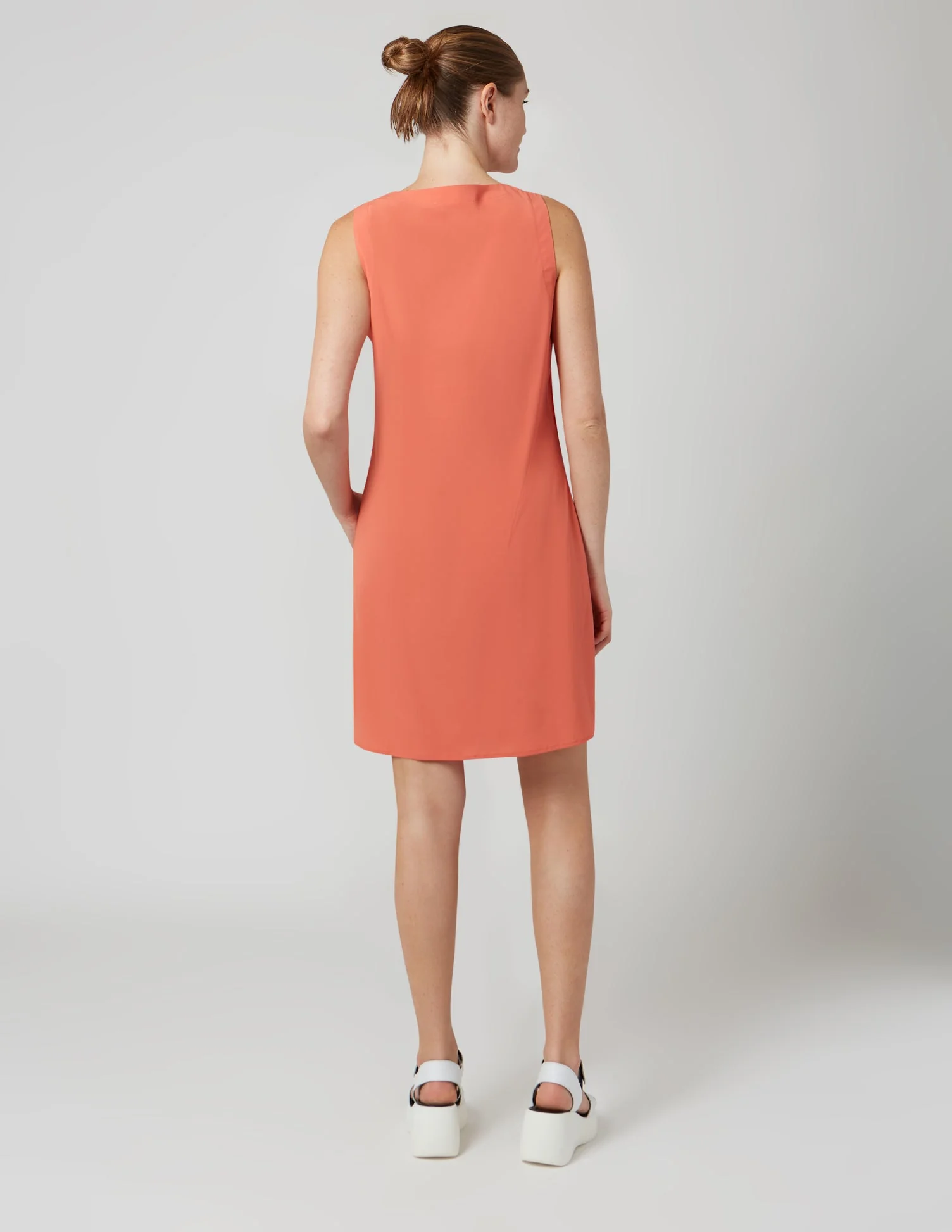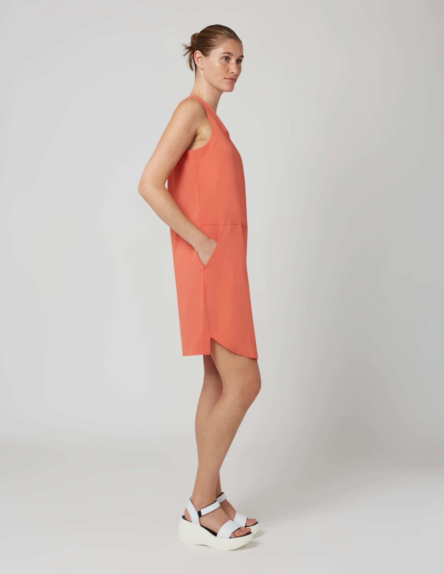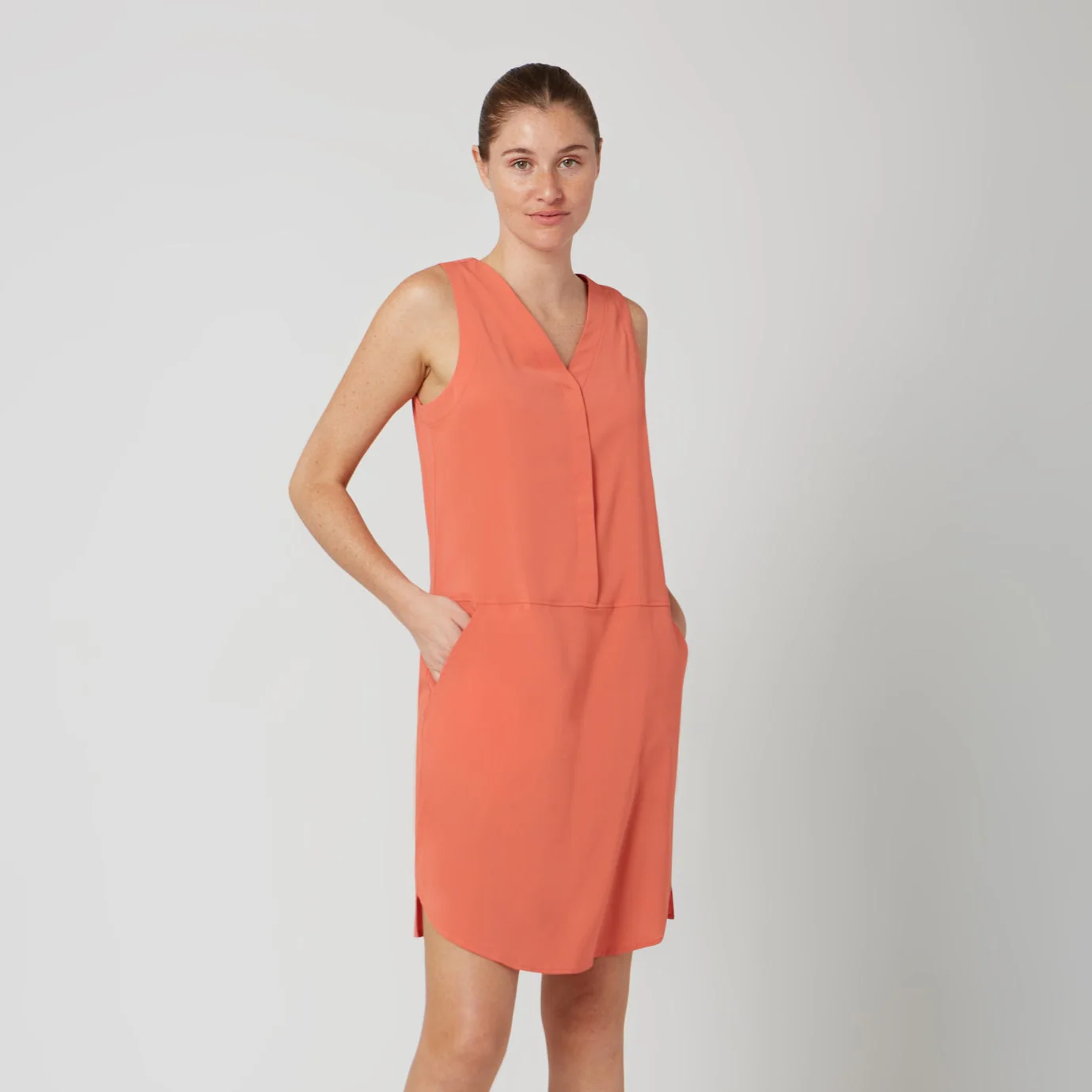 Robe sans manches avec encolure en « V », coupe droite avec deux poches obliques et ourlet courbé au-devant.