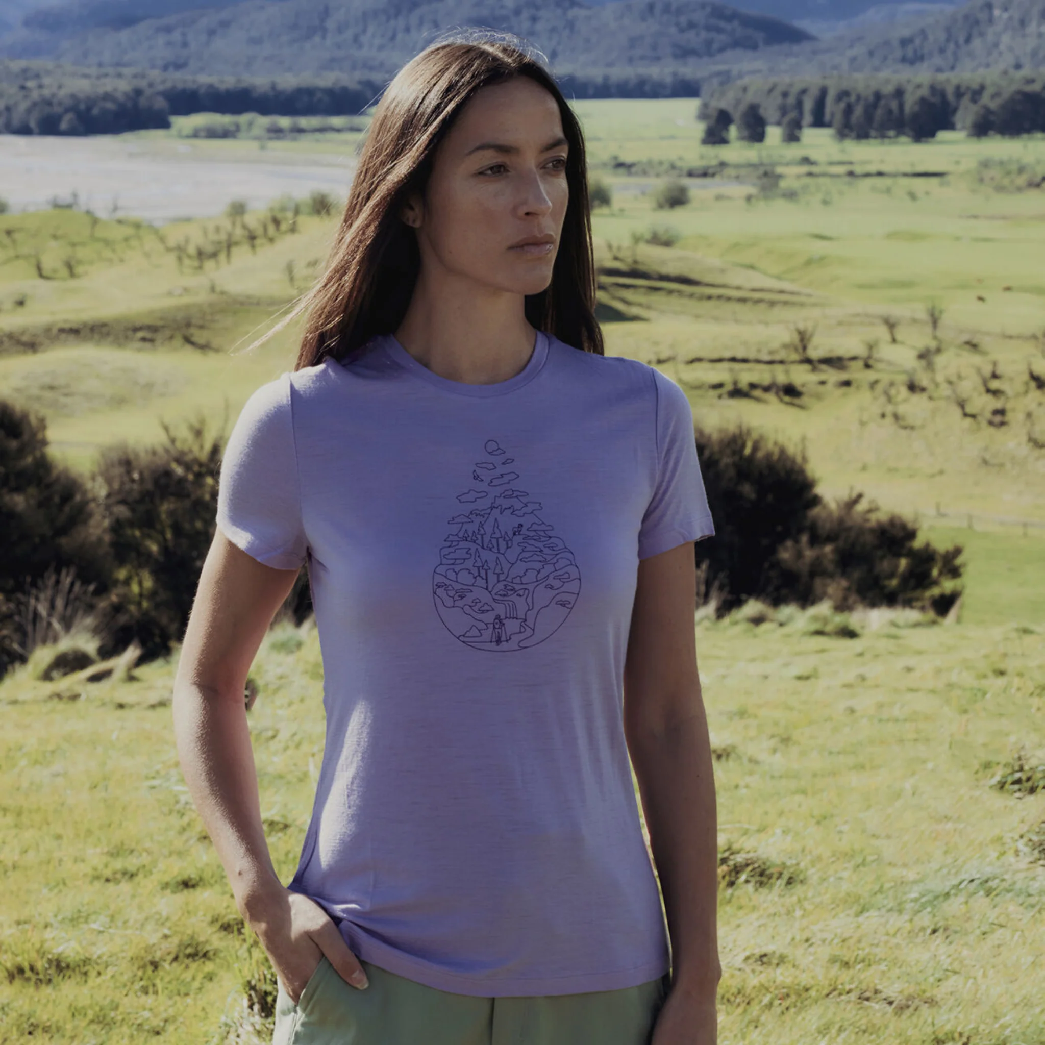 Le t-shirt manches courtes pour femme Tech Lite III Hike Path de Icebreaker est 100 % mérinos avec l’illustration d’une randonneuse d’Ami Rogers.