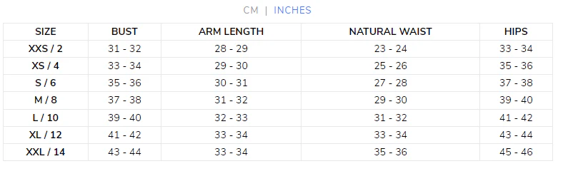 Longueur : XXS/22,5″, XS/23″, S/23,5″, M/24″, L/24,5″, XL/25″, XXL/25,5″.